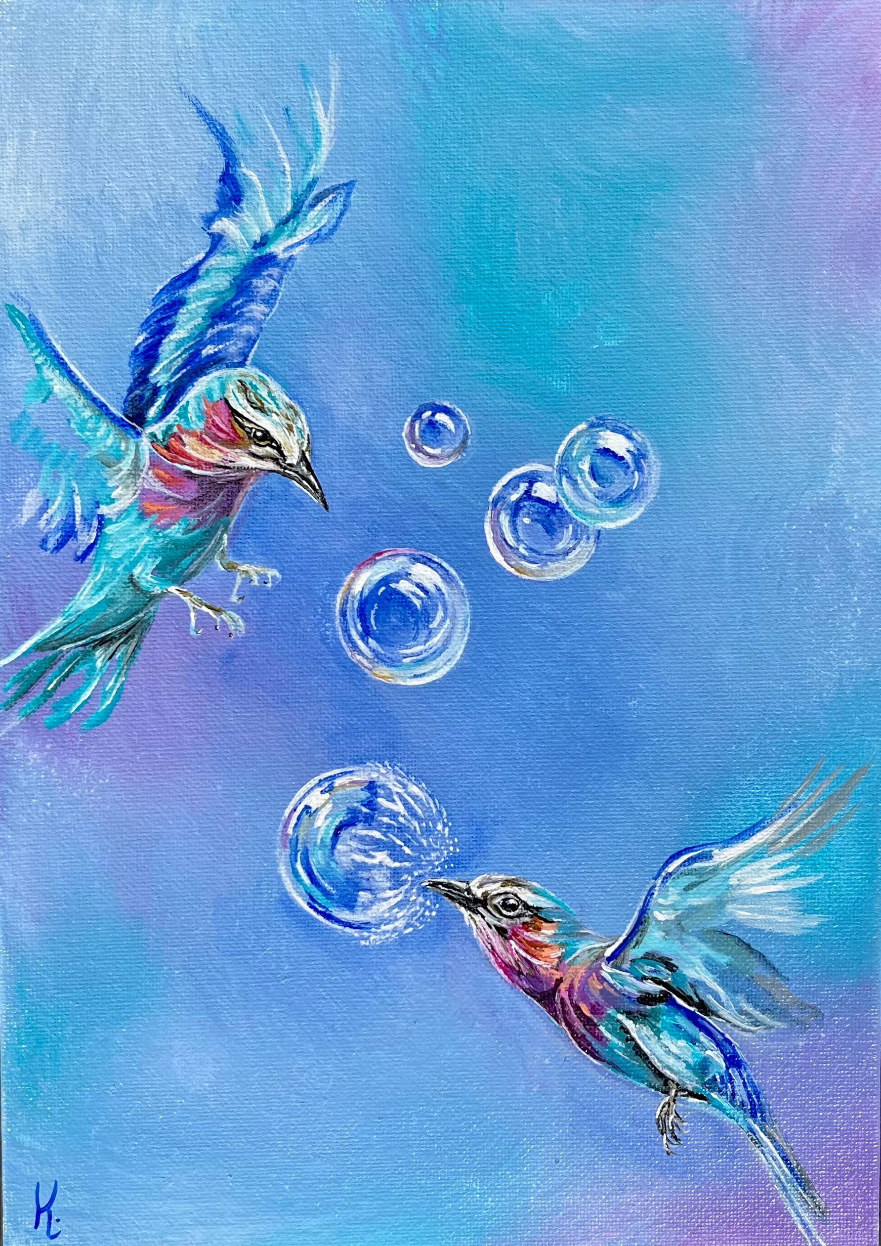 ”Lilac Burst” captures the brilliance and vibrancy of two lilac breasted roller birds in a playful moment, surrounded by delicate and whimsical bubbles. Created with stunning colours and intricate details, this piece is a must-have for any art lover looking to add a touch of nature and joy to their space.