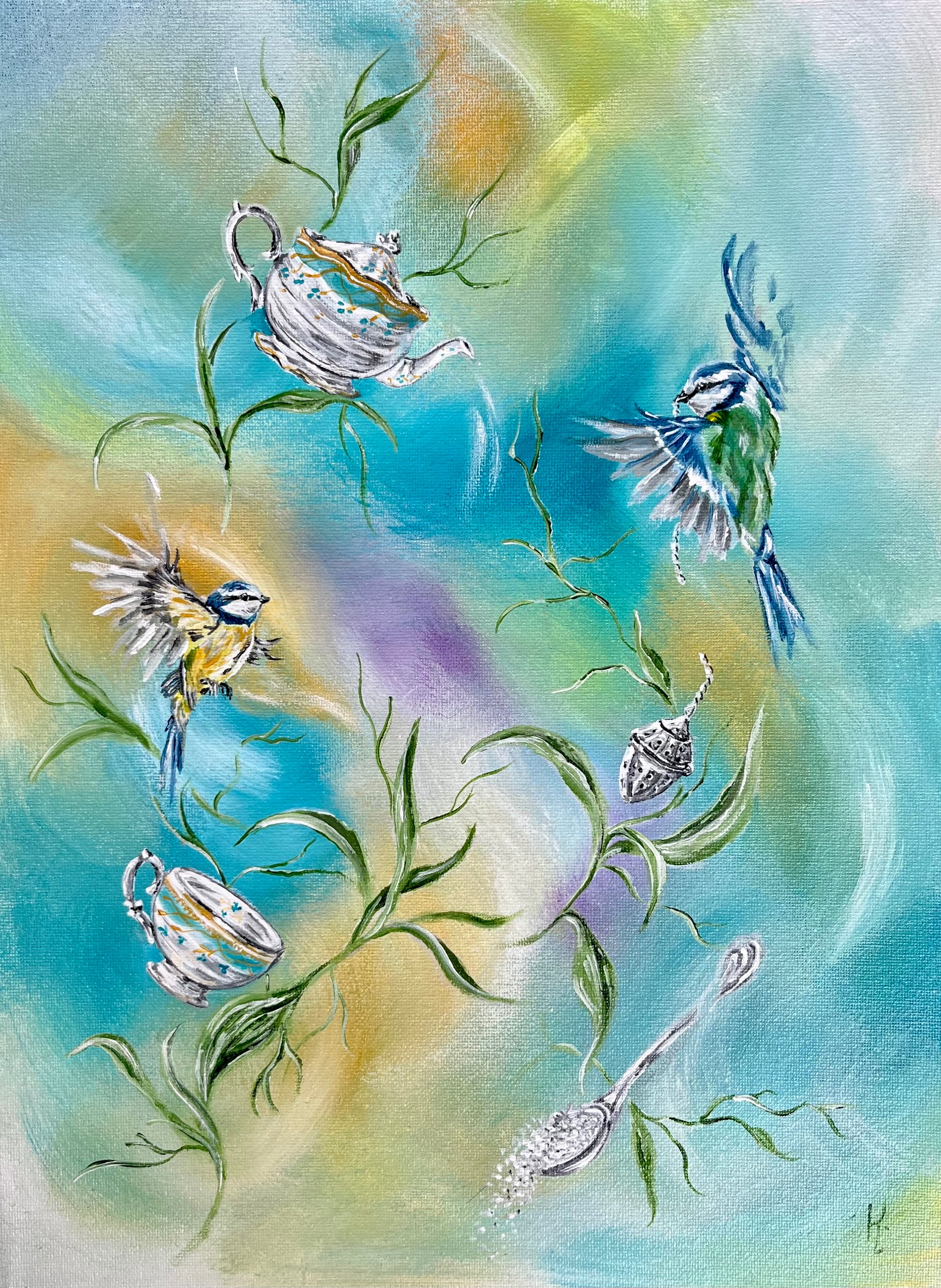 Experience the perfect British cup of tea with Time for Tea. Featuring a vibrant painting of blue tits and all the essential items, including teapot and tea strainer. Enhance your tea ritual with this beautiful artwork.